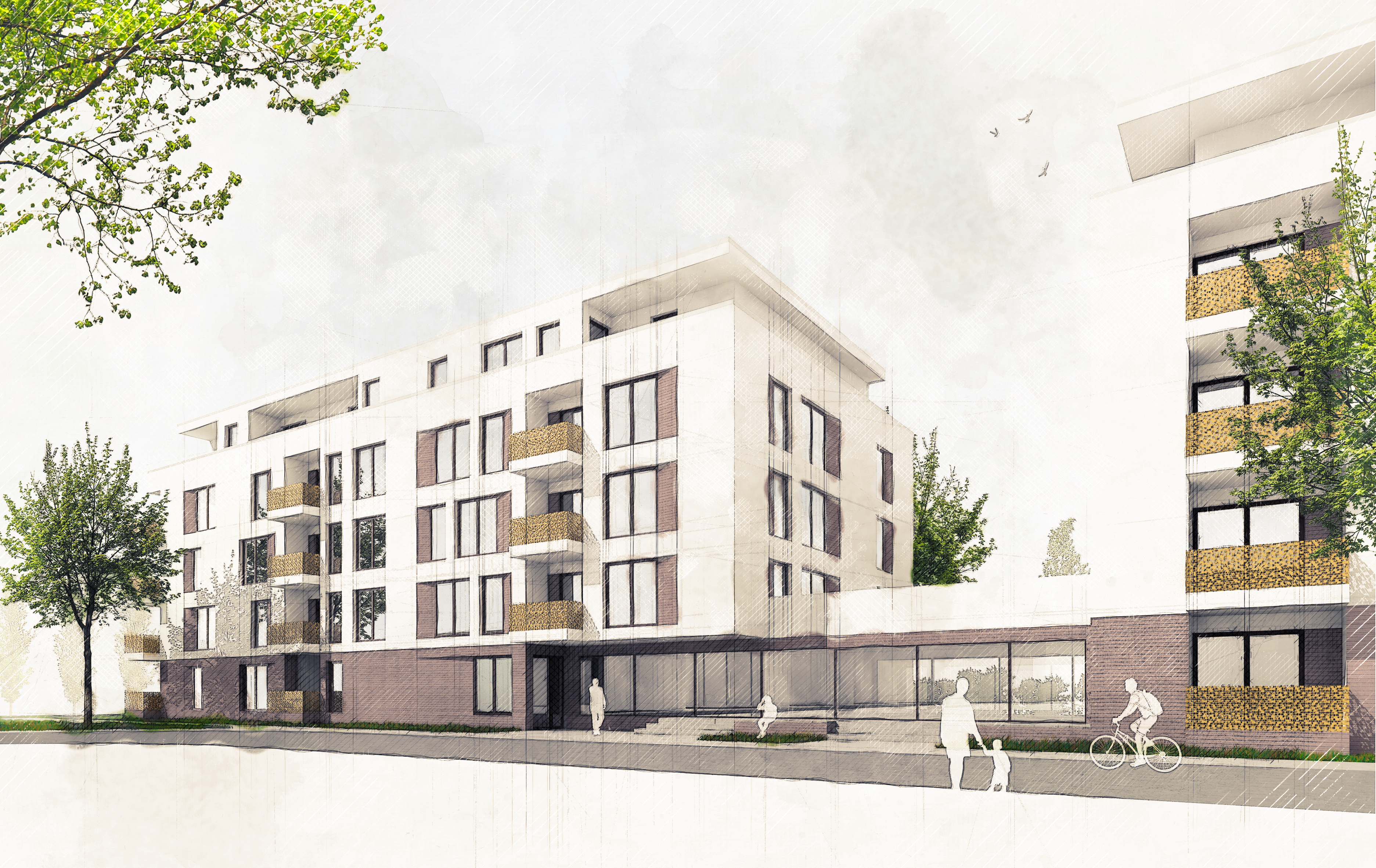grundsätzlich sieht der entwurf wertige detailausbildungen und materialien vor; gerade die balkone bzw. loggien bilden mit ihren flächigen, mit gelaserten floralen mustern und goldeloxierten oberflächen einen angenehmen kontrast zur bewusst ruhig gestalteten putzfassade.